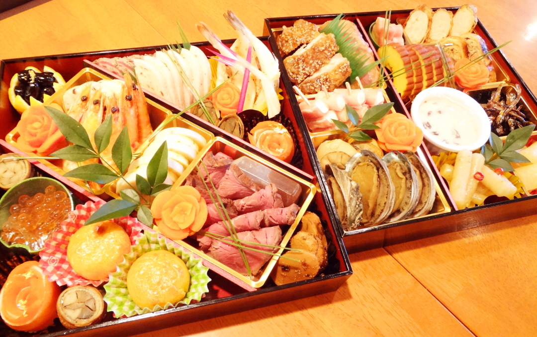 | いくら醤油漬け・スモークサーモンと千枚蕪の花巻・ローストビーフ・スイートポテト・鮑の旨煮・帆立のエスニック和え・牛タン入りボロニアソーセージ・河豚のハーブグリル・数の子・蟹爪のバジル漬け・有頭海老マリネ・奥美濃古地鶏のしっとり鶏ハム・菊花蕪漬け・田作り・各種テリーヌ・ミートローフ・レーズンバター・鰊の八幡巻き・たたき牛蒡・フロマージュムースベリー・ガトーショコラ・クリームチーズの生ハム巻き・ベーコンとアスパラのキッシュ・伊達巻き・・・・etc ※写真はイメージです |